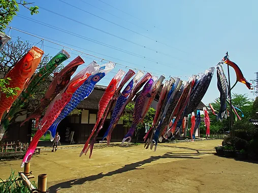 5月こどもの日まで、前庭にたくさんの鯉のぼりが泳ぎます。